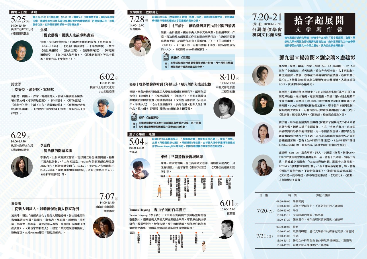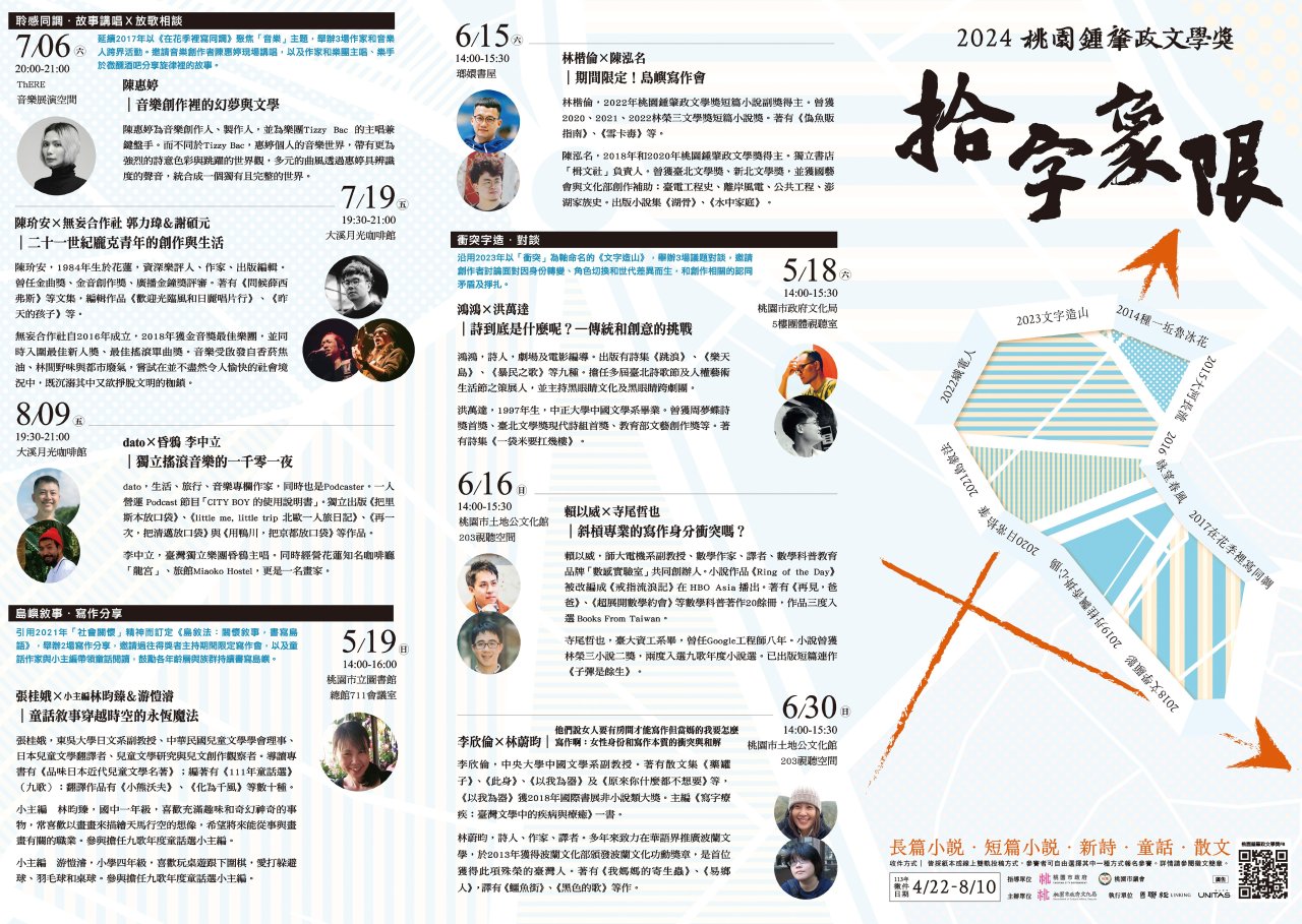三、 旨揭活動於5至8月辦理相關系列活動,歡迎踴躍報名,徵文辦法及活動詳情可至桃園鍾肇政文學獎FB粉絲專頁(https://reurl.cc/ezEjeL)或活動官網(https://reurl.cc/qVgM7N)查詢。