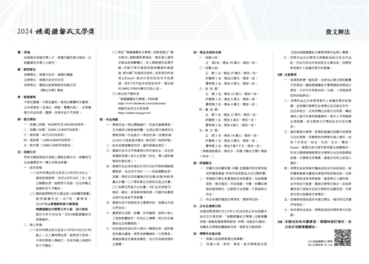 一、 旨揭徵文活動自即日起至113年8月10日收件截止,採紙本及線上投稿,共分為長篇小說、短篇小說、新詩、童話及散文等5類。