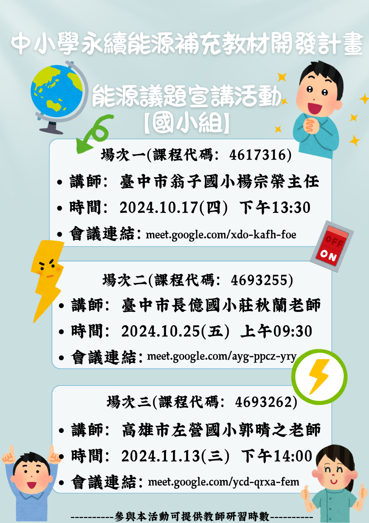 (一) 【國小組】場次一 (課程代碼:4617316);講師:臺中市翁子國小楊宗榮主任;時間:113年10月17日(星期四) 下午13:30至15:00;Google Meet連結:meet.google.com/xdo-kafh-foe。
