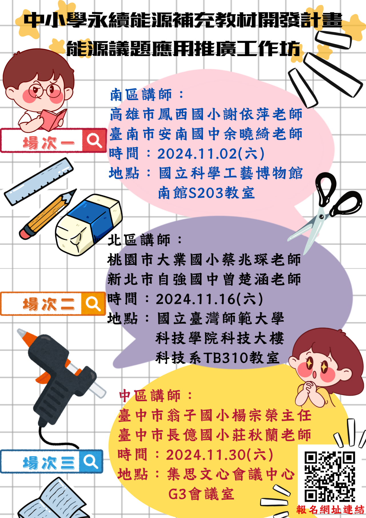 主旨: 函轉國立高雄師範大學依「中小學永續能源補充教材開發計畫」辦理「能源議題推廣應用工作坊」北、中、南三場次,請查照。