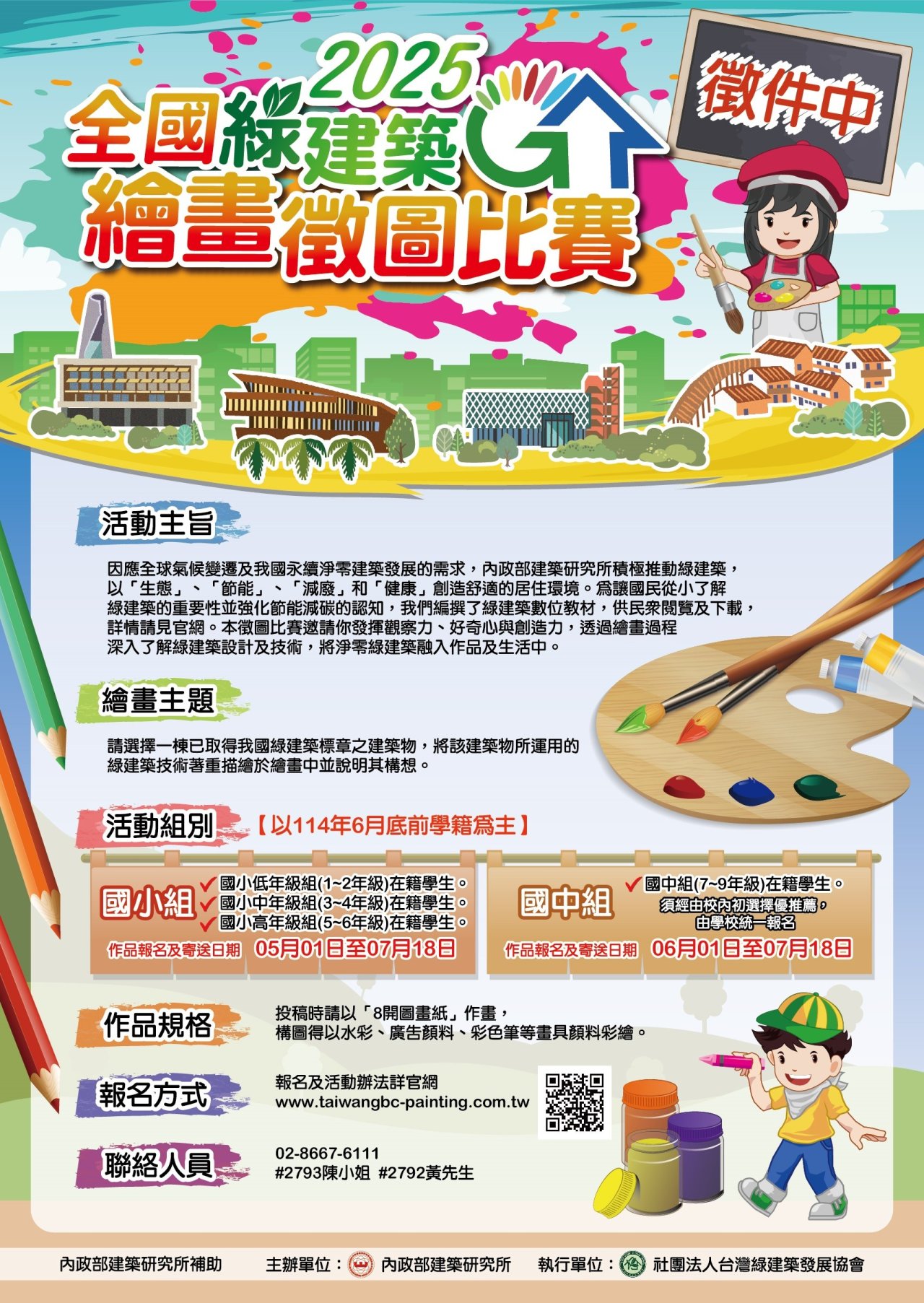 主旨: 本所本(114)年度辦理「2025全國綠建築繪畫徵圖比賽」,敬請鼓勵貴校學生踴躍報名參加,請查照。