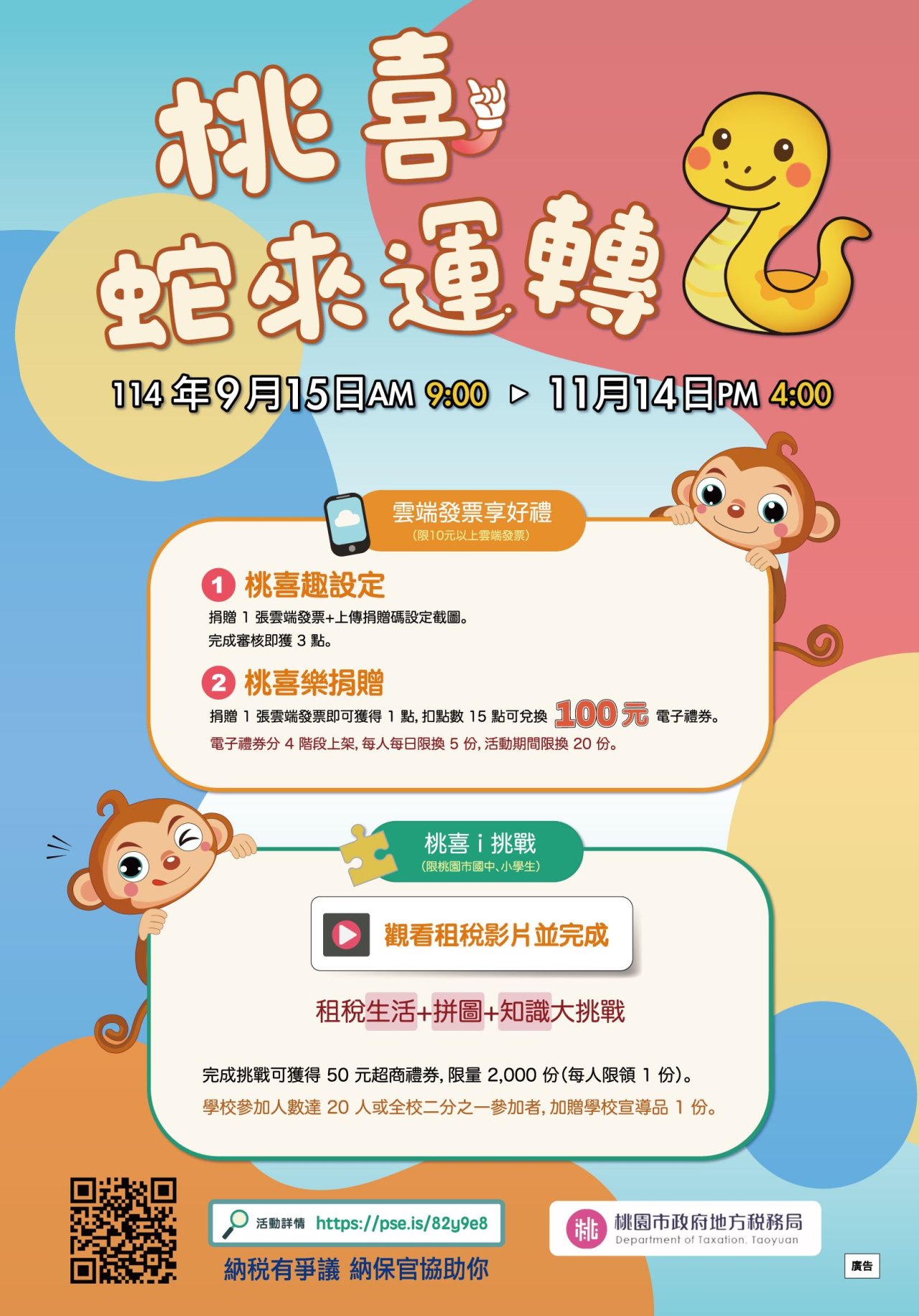 一、 為有效推廣校園租稅教育,強化學生對租稅認識之深度及廣度,落實租稅教育向下扎根校園之目的,本局舉辦「桃喜蛇來運轉」網路活動,特別規劃「桃喜i挑戰」單元(詳活動內容三),請貴校協助利用電腦課程時間、校園網站、佈告欄或其他方式協助宣導,鼓勵學童及教職員踴躍參加。
