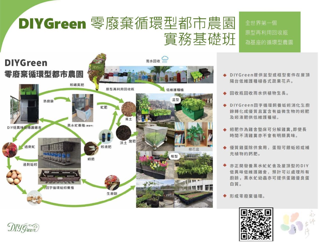 二、DIYGreen 循環型都市農園為該校環境工程研究所高正忠教 授研究群所開發,是全世界第一個以回收瓶為基座的 DIY 循環型農園。可在水泥地上創造出綠地供種蔬果花卉,適 合從小孩至長者所有年齡層DIY施作。可在任何平坦水泥地 上(包括陽台、露台、平地或屋頂)DIY 建置出一個可供種 植安心優質蔬菜水果及花卉植物的農園。它可緩解台灣的 三大環保問題,包括減輕熱島效應、原型再利用回收瓶及 消化廚餘,且具有諸多環保及食安等效益,有原綠屋頂的 所有效益,但無傳統綠屋頂在台灣應用的缺點,且諸多環 保食安效益及特點。三、113年3月5日推出DIYGreen單盆體驗班及DIYGreen盆型基礎 班兩門課程。