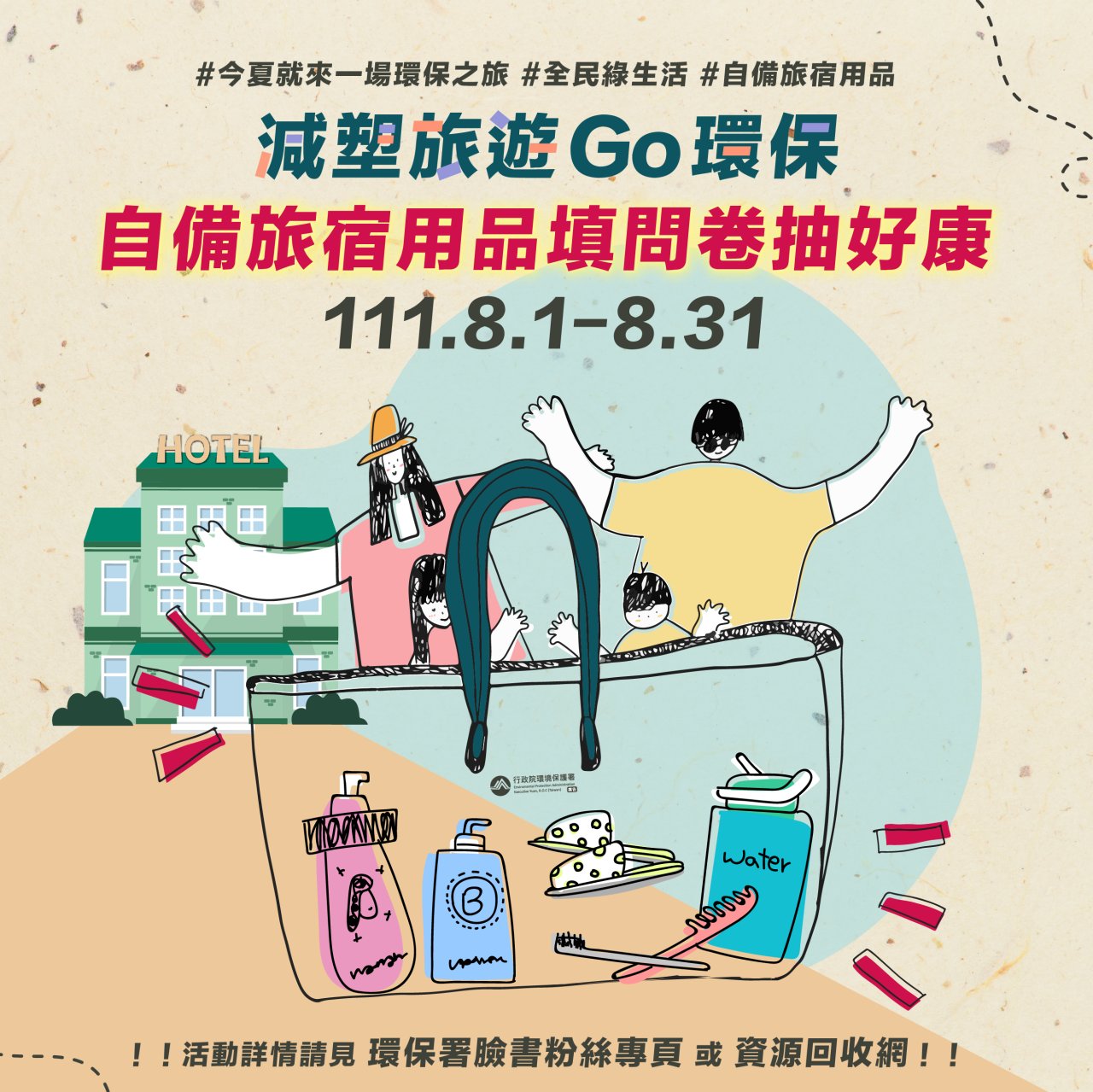 二、為鼓勵民眾暑期旅遊響應自備旅宿用品,減少一次性備品使用,本署臉書舉辦「減塑旅遊GO環保 自備旅宿用品填問卷抽好康」抽獎活動,民眾只要於活動期間(111年8月1日起至8月31日止)自帶旅宿用品與房卡一起拍照上傳本署臉