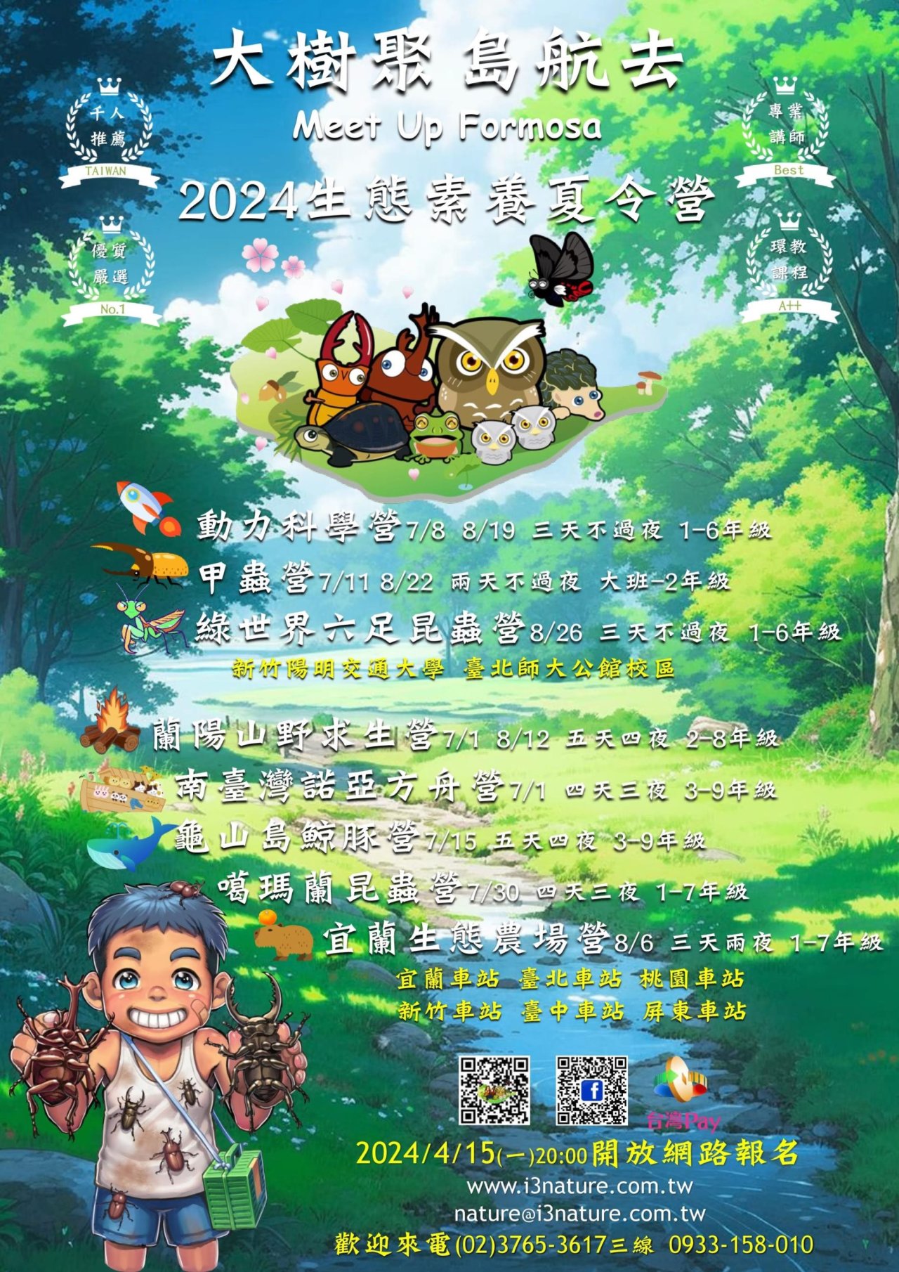 說明:愛上大自然文教將於113年7月1日~8月28日舉辦【大樹聚島 航去】2024生態素養夏令營共八種生態主題營隊課程。