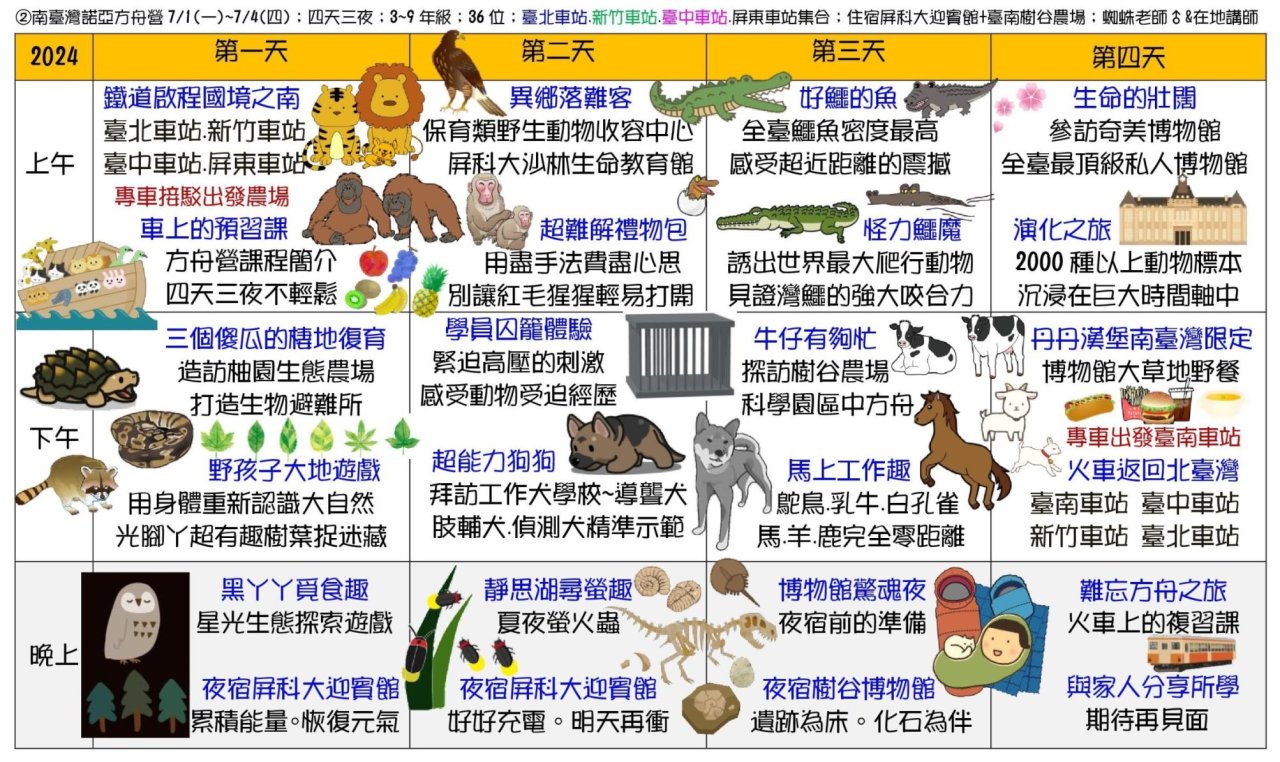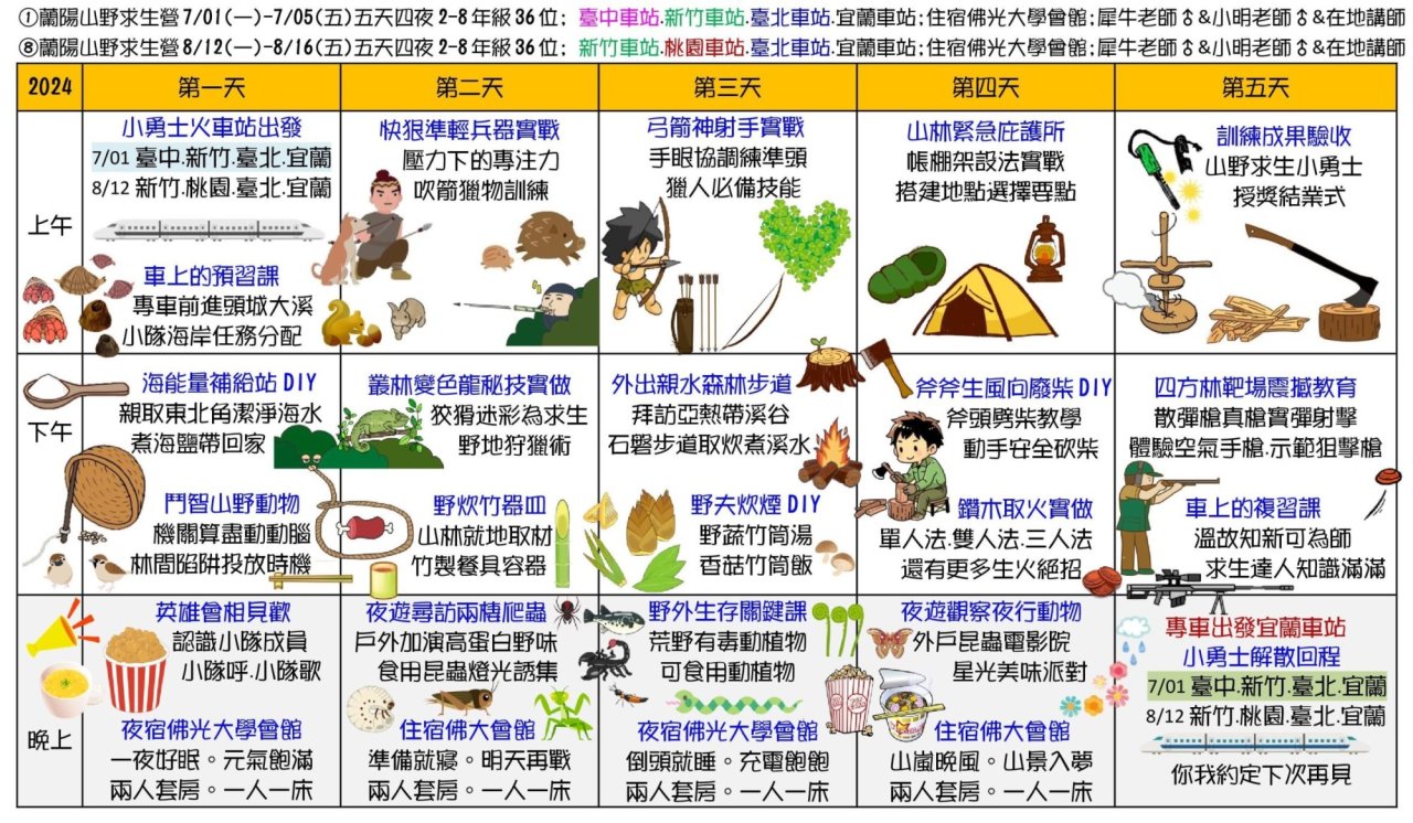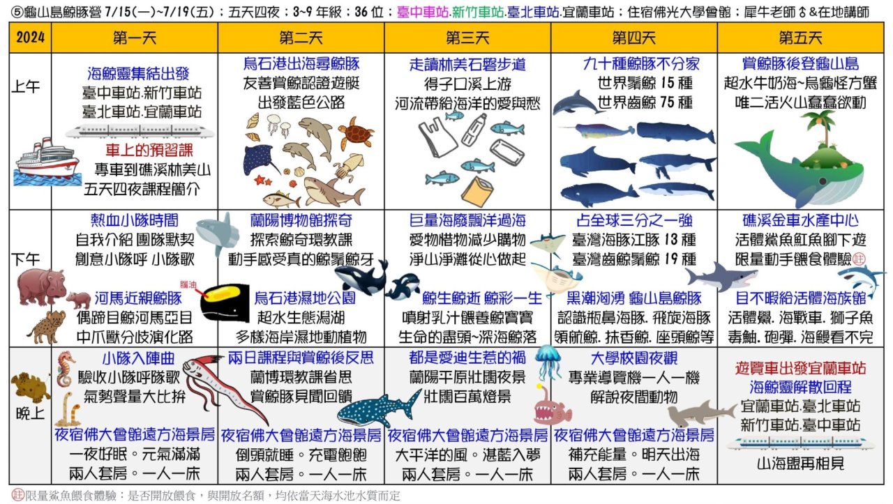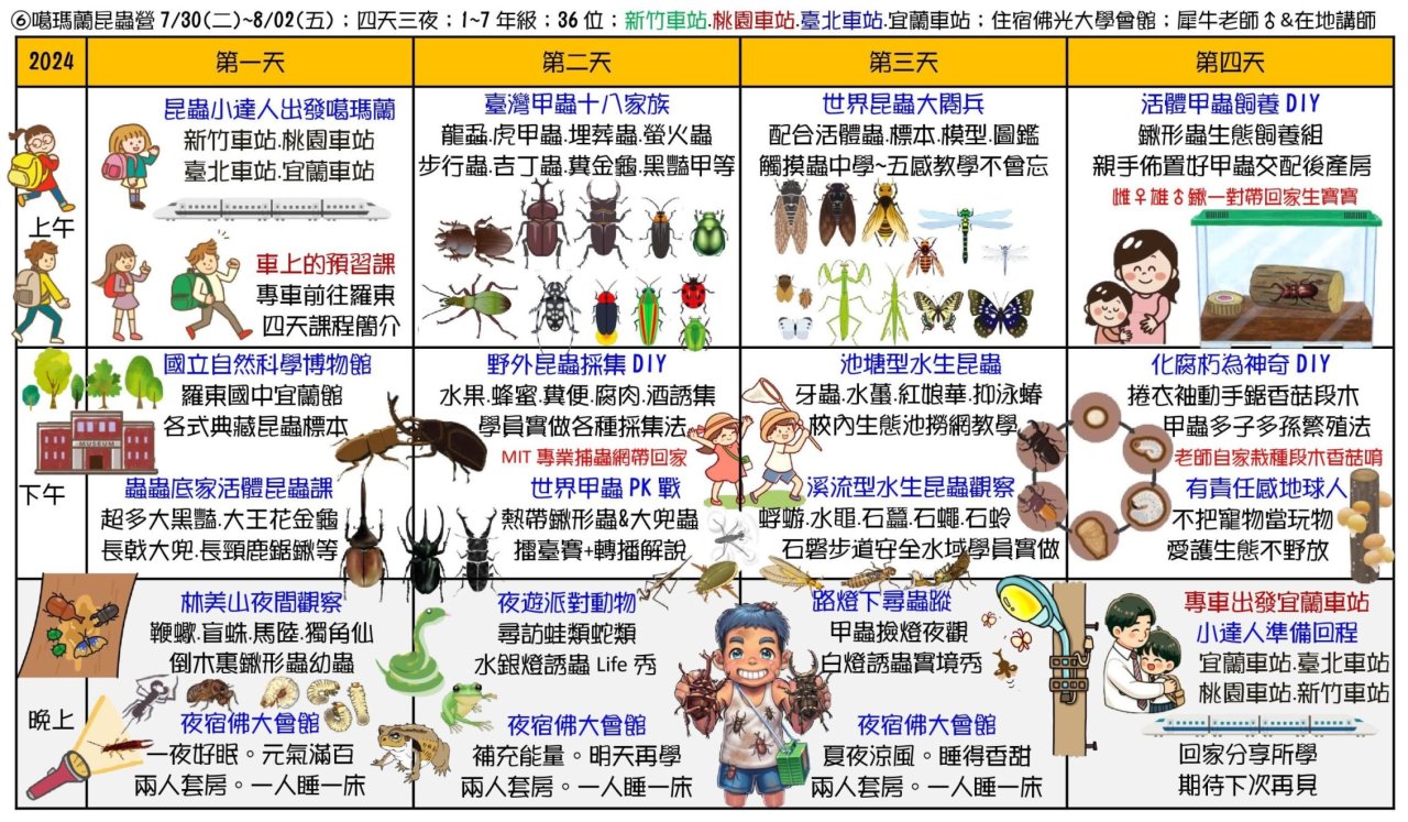 三、課程主題:蘭陽山野求生營、南臺灣諾亞方舟營、龜山島 鯨豚營、噶瑪蘭昆蟲營、宜蘭生態農場營、動力科學營、 甲蟲營、綠世界六足昆蟲營。