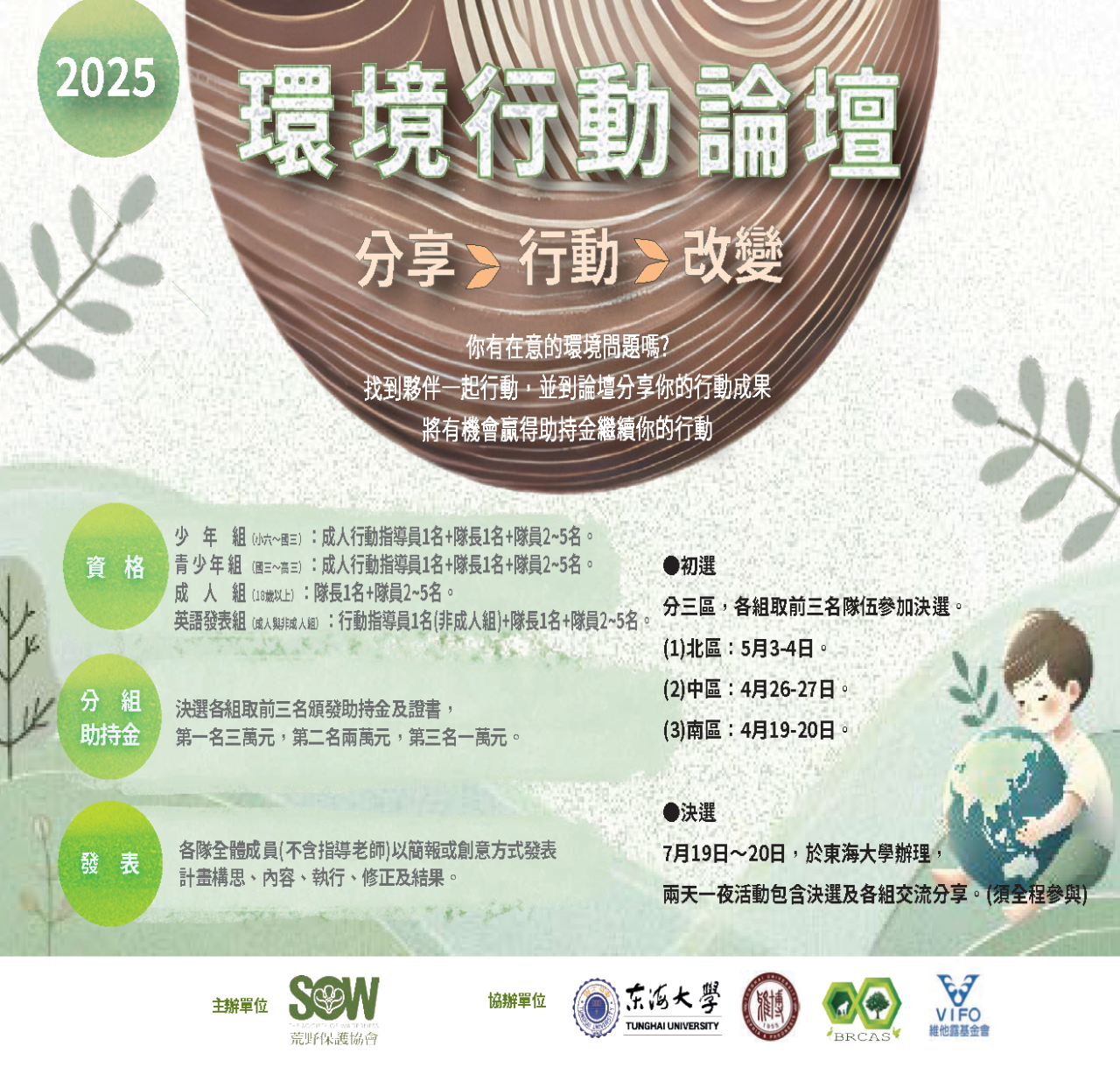 主旨: 檢送社團法人中華民國荒野保護協會辦理「第十一屆環境行動論壇」簡章及海報各1份,請查照。